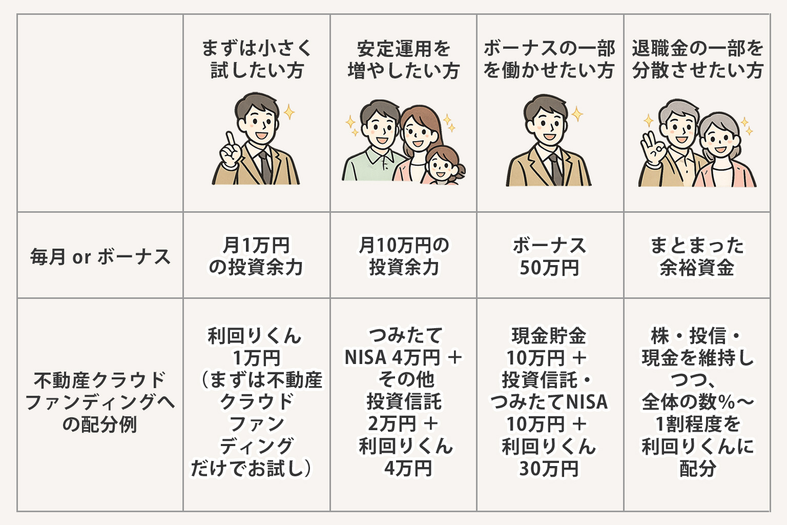 | 毎月 or ボーナス | 月1万円の投資余力 | 月10万円の投資余力 | ボーナス50万円 | まとまった余裕資金 |